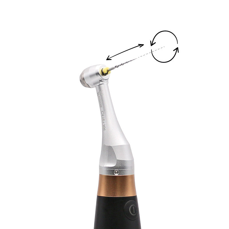 El contra-ángulo giratorio con movimiento alternativo vertical facilita la progresión de la lima en el canal y permite el paso seguro de los rebordes o escalones de forma suave.